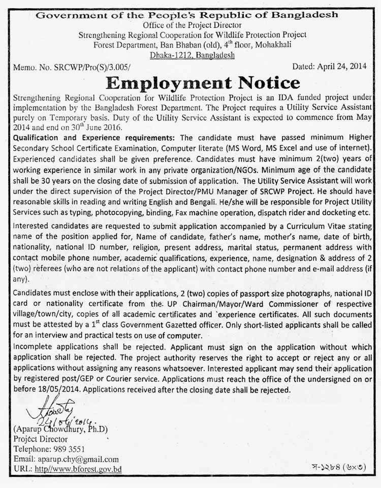 Strengthening Regional Cooperation for Wildlife Protection Project, Forest Department - Utility Service Assistant.