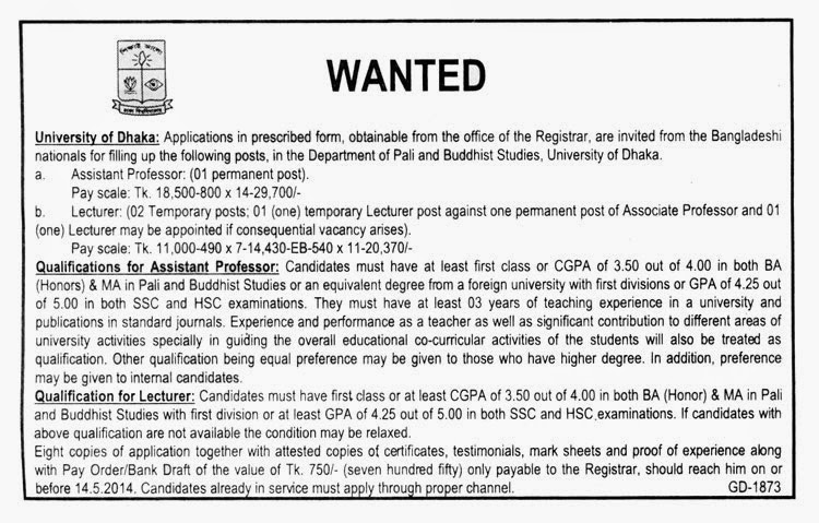 - Candidates must have at least first class/ CGPA 3.50 out of 4.00 in both BA (Honours) & MA in Pali and Buddhist Studies or an equivalent degree from a foreign University with first divisions or GPA of 4.25 out of 5.00 in SSC & HSC Examinations.